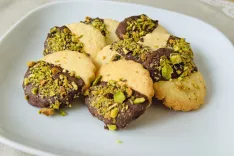 Skupaj zmešamo moko, grobo mlete pistacije, mleti sladkor, pecilni prašek, vaniljev sladkor in sol. Dodamo na lističe narezano maslo in jajce. Vse skupaj zgnetemo v testo. Testo zavijemo v prozorno folijo in ga za vsaj pol ure postavimo v hladilnik. Spočito testo razvaljamo na pomokani površini približno pol centimetra na debelo. Iz testa s pomočjo modelčka izrezujemo piškote in jih polagamo na pekač, prekrit s peki papirjem. Piškote pečemo v pečici, segreti na 180 °C, 15 minut. Piškote ohladimo. Temno čokolado stopimo nad vodno kopeljo ter vanjo do polovice pomakamo ohlajene piškote. Piškote polagamo na pekač, prekrit s peki papirjem. Po čokoladi potresemo še nasekljane pistacije. Pustimo, da se čokolada na piškotih povsem strdi, nato piškote poberemo v posodo.