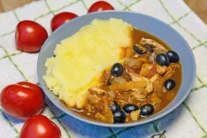 Čebulo in česen olupimo ter nasekljamo, korenje narežemo na tanke trakove, paradižnik na kocke. Piščančje fileje narežemo na manjše kose, solimo in popramo ter jih na olivnem olju popečemo do zlato rjave barve. Dodamo nasekljano čebulo in česen ter pražimo nekaj minut, dokler čebula ne postekleni. Nato vmešamo korenje in pražimo še 5 minut. Dodamo še narezan paradižnik, origano, sol in poper. Vse skupaj kuhamo na srednjem ognju približno 20 minut, da se omaka zgosti in korenje zmehča. Tik pred koncem kuhanja primešamo črne olive in omako kuhamo še 2–3 minute. Postrežemo z izbrano prilogo, npr. polento in pire krompirjem.