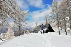 Z ogromnim nahrbtnikom na eni in smučkami na drugi rami stopim z nihalke in vase globoko potegnem svež oster zrak. Večeri se, z neba pa rahlo naletavajo drobne snežinke. Hitro si oprtam nahrbtnik, nataknem smuči in se poženem za Nejcem, ki je že izginil proti zadnjemu Voglu. Vijugava po sveže potegnjeni progi, se poganjava v klance, zadihana snameva smuči in kar peš trmasto zagrizeva v zadnjo strmino. In jo le zagledava, skrito med belimi »kuclji«, hišico iz temnega lesa z rdečimi okni in zelenimi polkni, izpred katere nama veselo maha Jan. Na kotni mizi je že postavljen lonec s testeninami in še eden s toplo juho, zraven pa kraljuje debel hlebec domačega kruha.