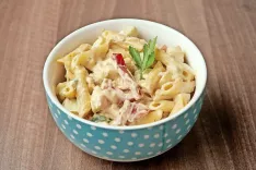 Za pripravo testeninske solate potrebujemo: 200 g peresnikov, 2 jajci, 1 paradižnik, 1 kumaro, ščep origana, 1 žlico olivnega olja, 2 žlici balzamičnega kisa, 2 žlički gorčice, 2 žlici grškega jogurta ali kisle smetane, sol in poper.