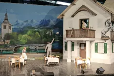Navduši tudi sama scena; platno, največje do sedaj, je znova poslikal Jože Napotnik, dve nadstropni stavbi, ki ponazarjata hotela, pa sta delo Avguština Galesa in Urške Gregorič. Kot kostumografinja se pod letošnjo predstavo podpisuje Andreja Stržinar.