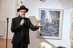 Ciril Horjak pripoveduje zgodbo o ilustraciji, ki jo je za časnik Večer pripravil ob povodnji avgusta 2023. / Foto: Tina Dokl