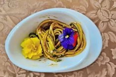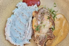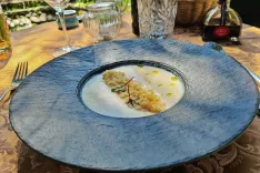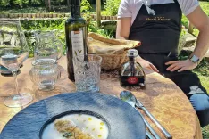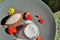 Zanimiva je bila hladna predjed: jelenov karpačo, ki je skrival okusno panakoto, ki je z izbranima olivnim oljem in balzamičnim kisom ustvarjala grižljaje, ki so se kar topili v ustih in si njihov okus še danes lahko prikličem v spomin. Cvetačno juho sta »zabelila« inčunov crumble (drobljenec) in ponovno ekološko ekstra deviško oljčno olje Leccino (Korenika & Moškon), tokrat glavni spremljevalec menija. »Krškopoljcu« sta na krožniku delali družbo domača jagodna marmelada in lisičina krema. Zaupali so mi, da meso krškopoljskega prašiča pri njih pripravijo drugače, kot smo vajeni, in da so kos na krožniku najprej malce popekli na žaru, potem dali v vroče maslo z rožmarinom in belo čebulo, tako je nekaj minut odležal in nato so ga ponovno vrnili na žar.
