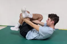 1. vaja – presta: S to vajo bomo raztegnili veliko zadnjično mišico. Vajo izvajamo tako, da ležimo na hrbtu. Desno nogo imamo pokrčeno, gleženj leve noge pa je na stegnu pokrčene noge. Z rokami se primemo za golen desne noge (leva roka gre skozi »trikotnik« leve noge). Nogo povlečemo čim bolj k sebi.