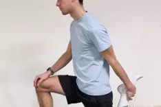 2. vaja – izpadni korak s kolenom na tleh: Pri tej vaji bomo raztegovali štiriglavo stegensko mišico (kvadriceps). Začetni položaj vaje: desna noga pokrčena spredaj. Kot v kolenu je 90 stopinj. Z levo nogo klečimo. Z levo roko se primemo za gleženj leve noge. V tem položaju smo 10 sekund. Za otežitev vaje se lahko z boki rahlo pomikamo naprej. Potem nogi še zamenjamo.