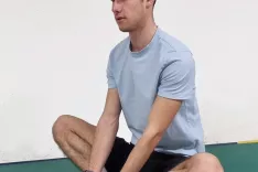 5. vaja – raztezanje primikalk kolka (metuljček): Začetni položaj vaje je sedeč. Spodnja dela stopal se dotikata pred boki. Z rokami se primemo za gležnje. S komolci se opiramo na kolena in jih potiskamo proti tlom. Pazimo, da je hrbet raven. V položaju vztrajamo vsaj 10 sekund.