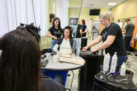 V dobrodelnem dogodku Postrizimo Kranj za dober namen je sodelovalo več kot 25 dijakinj in dijakov frizerske smeri. / Foto: Tina Dokl