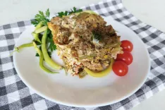 Stročjemu fižolu odstranimo konce ter ga narežemo na približno 3 cm dolge palčke. Čebulo olupimo ter sesekljamo. V ponvi segrejemo polovico olja, prepražimo polovico čebule ter dodamo pripravljen fižol. Solimo, popramo ter potresemo z mleto rdečo papriko, premešamo in dušimo 30 minut. V drugi ponvi na preostalem olju prepražimo drugo čebulo, dodamo mleto meso, solimo in popramo ter pražimo 10 minut, da se meso zlatorjavo zapeče. Na koncu k mesu vmešamo še nasekljan peteršilj. Za preliv stepemo jajca ter jih zmešamo s kislo smetano in mlekom. Srednje velik pekač namastimo ter na dno razporedimo polovico dušenega fižola. Čezenj damo prepraženo meso, ki ga prekrijemo s preostankom fižola. Vse skupaj prelijemo z jajčnim prelivom in pečemo v pečici, segreti na 200 °C, približno 30 minut.