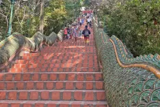 Do templja se lahko pripeljete z avtom ali pa – tako kot midva – uberete težjo, a izjemno slikovito Menihovo pot (Monk's Trail), ki se začne tik nad zahodnim delom mesta, obide skriti tempelj Wat Pha Lat in se po dveh urah hoje v precejšen klanec zaključi na terasah templja Wat Phra That Doi Suthep. Ta leži na nadmorski višini okoli 1050 metrov in ponuja spektakularen panoramski pogled na mesto, ki naj bi bil še posebno lep ob sončnem zahodu ali v jutranji meglici. Najbolj znan del templja je mitološko stopnišče s 306 stopnicami, obdano z dolgima kačama (naga), ki simbolizirata zaščito in prehod v sveti prostor oziroma v osrednji del templja, kjer stoji zlata stupa – ena najsvetejših budističnih točk na severu Tajske.