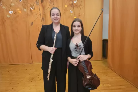 Nastopili sta tudi Manca in Neža Fajdiga. Manca je zaigrala na prečno flavto, Neža pa je svojo glasbeno ustvarjalnost pokazala z violino. / Foto: Nika Toporiš