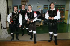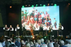Ansambel bratov Poljanšek v razširjeni zasedbi na odru športne dvorane v Kamniku / Foto: Alenka Brun