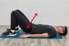 2. vaja – dvig bokov: Pri izvajanju te vaje najbolj obremenjujemo veliko zadnjično mišico. V začetnem položaju vaje ležimo na hrbtu. Noge so pokrčene, roke so ob telesu. Dvigujemo in spuščamo zadnjico. Če želimo vajo otežiti, iztegnemo eno nogo.