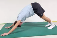 5. vaja – strešica: S to vajo raztegujemo ramenski obroč. Vajo izvajamo v opori na dlaneh in stopalih, noge in roke so iztegnjene, prepognjeni smo v bokih. Rame poskusimo potisniti v isto linijo, kot je trup, glava pa je med rokami v podaljšku trupa. Pomembno je, da so noge iztegnjene.