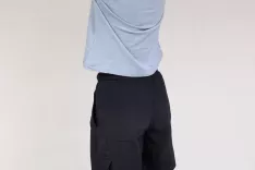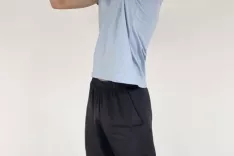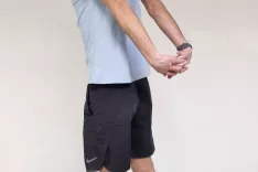 2. vaja – odmik roke vstran: Stojimo, noge so v širini ramen. Roko iztegnjeno premaknemo čez trup in jo z drugo roko zadržimo na podlahti.