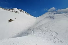 Predlagam, da se vrnemo po poti vzpona oziroma vse do klopce v Prižnici sestopimo po žlebu, ki v teh dneh, ko je tam še nekaj snega, nudi hiter sestop. Ampak previdno. Če je sneg pretrd, se hitro lahko zgodi nepotrebna nesreča, če je sneg južen, se pa močno predira.