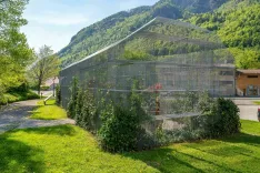 Sodobna konstrukcija iz kovinskih mrež, odeta v zelenje, ki ponazarja tloris nekdanje Korenove hiše / Foto: Nik Bertoncelj