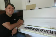 Tomaž Bergant ob obnovljenem belem pianinu znamke Petrof / Foto: Igor Kavčič