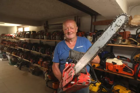 Ko se oglasi na telefonski klic, ob brnenju stroja zaslišim: »Trenutno sem v blatu, čistimo pot, rijemo kot divji prašički.« Franc Martinjak je slišati zelo dobre volje. »A čez nekaj ur bom že doma, kar pridite naokrog,« me v isti sapi povabi na ogled svoje bogate zbirke motornih žag.