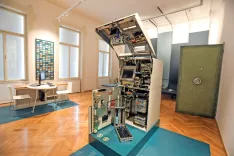 »Tako pa je od znotraj videti bankomat,« naju povabi Čukova. »Ta je iz devetdesetih let, ko so bili v kasetah še tolarji.« Nič kaj kompaktno ni videti razdrti posredovalnik denarja. Odprejo ga lahko samo delavci iz trezorja, ki vanj vstavljajo zaprte kasete z denarjem,« poslušam o bankomatu pred seboj. Ampak kako deluje? V režo vtaknemo kartico, vtipkamo pin in izberemo znesek. Informacija o kartici odpotuje v procesni podatkovni center, ki preveri, ali je številka pravilna. Če je kartica tuja, gre po preverjanje v tujino. Preveri tudi stanje na računu. Ko dobi od vseh instanc informacijo, da sta kartica in stanje v redu, odgovori in odobri dvig. Vse to se zgodi v le nekaj sekundah.