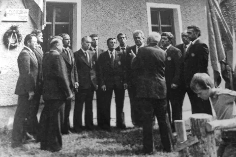 Moški pevski zbor na gostovanju v Gorjah s pevovodjem Janezom Grmom, 1966