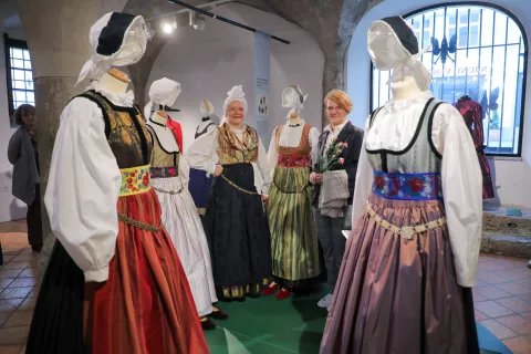 Razstava izdelkov poustvarjalk oblačilne dediščine Andreje Stržinar in Sonje Porenta, ki so jo pred dnevi odprli v Galeriji Mestne hiše in v Stebriščni dvorani Gorenjskega muzeja, je že na uvodnem dogodku potrdila svoj pomen in široko zanimanje med ljudmi. »Razstavljamo sicer predmete, oblačila, ampak kaj bi ta brez ljudi. Brez tistih, ki jih naredijo, brez tistih, ki jih nosijo, in brez tistih, ki jih občudujejo. Pa tudi brez tistih, ki iz njih naredijo cel šopek, kot smo ga v muzeju s to razstavo,« je številne obiskovalce, kar nekaj jih je bilo oblečenih tudi v kostume narodnih noš, nagovorila mag. Tatjana Dolžan Eržen, ki je skupaj z dr. Ano Vrtovec Beno in v sodelovanju z obema avtoricama izdelkov pripravila razstavo z naslovom Njuno veselje je naše bogastvo. K pripravi razstave sta pristopili še oblikovalka prostora Ariana Furlan Prijon in mlada grafična oblikovalka Klara Peternel.