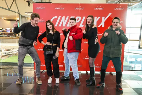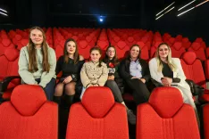 Režiser Toni Cahunek in ob njem zvezde dokumentarnega filma Novi sošolci: (z leve) Suela Gashi, Masar Maloku, Floralba Avdullahu in Ledri Gashi. / Foto: Tina Dokl