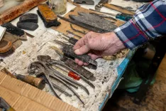 En kvadratni meter materiala, pravi Pustovrh, gre za zgornji del škornja, kvadratni meter pa za spodnjega. Orodje, ki ga ima na čevljarski mizi, je razporejeno kot v operacijski dvorani. »Tu so škarje za pločevino, to je klinčar, pa 'cvikarce', po slovensko natezalke. Uporabljam jih, ko vlečem zgornji del na kopito. Te gotovo poznate, to so navadne klešče, tu imava ščipalke; pa nože, ki so že kar obrabljeni, saj jih uporabljam že več kot trideset let in jih tudi sam brusim. Tu je kljuka za vlečenje kopit iz čevljev. Pa magnet, osla, kladivo.« Omenjeno kladivo je Gregorij Pustovrh kupil, ko je bil še vajenec, leta 1952. Prav tako žlico, ki jo pokaže. »Sem jo že kar malo zlomil, pa imam tu še eno večjo, ki jo uporabljam, ko dajem kopita v čevlje, temu mi pravimo 'taca'. Tu so še razna šila, odrezila, kopita …«
