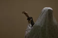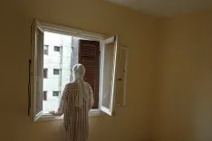 Shorook (arabsko: sončni vzhod), nadarjena grafična oblikovalka, je bila evakuirana iz Gaze v družbi matere, bolnice z rakom. Fotografirana je na balkonu stanovanja, gledajoč v sončni zahod. / Foto: Matic Zorman