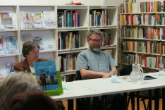Ob izidu stripa o Jakobu Aljažu so v Knjižnici Medvode pripravili pogovor z avtorjem Davidom Jensterlom, ki ga je vodila Marjeta Žebovec. / Foto: Ana Jagodic Dolžan