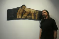 Mohor Kejžar pred muralom Poglej me v oči!, ki ga je na galerijsko steno naslikal za čas razstave. / Foto: Igor Kavčič