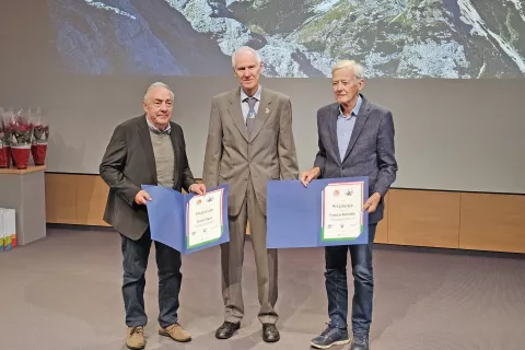 Priznanji je Francu Ekarju in Francetu Benediku podelil predsednik PZS Jože Rovan po jubilejnem srečanju na slovesnosti Planinske zveze Slovenije decembra lani. / Foto: arhiv PZS