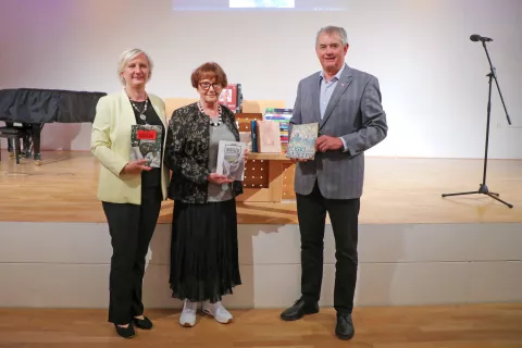 Predsednica Muzejskega društva Škofja Loka Helena Janežič, urednica Loških razgledov Marija Lebar in član izvršnega odbora Muzejskega društva Škofja Loka Aleksander Igličar so predstavili zgodovino in 70. izdajo Loških razgledov. / Foto: Tina Dokl
