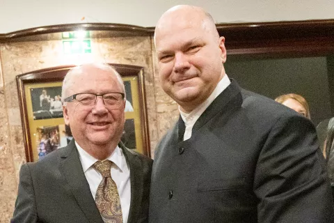 Po premieri: skladatelj Slavko Avsenik mlajši in dirigent Tomaž Kukovič / Foto: GŠ Kranj (Nika Bele)