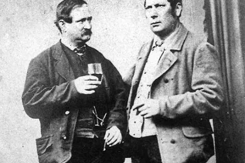 Tine Šturm (levo) in Aleš Paulin, ustanovitelj vinske trgovine, leta 1848 / Foto: arhiv Gorenjskega glasa