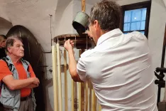 Janez Stele rad pojasni, kako so nastale Plečnikove sveče: »Plečnik je predlagal, naj v modele za lectova srca vlijejo čebelji vosek in ga odtisnejo na debele sveče.« / Foto: Katja Dolenc