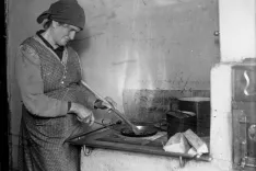 Kustosinja Špela Smolej Milat kot delavska žena na »šporhetu« na drva obiskovalcem skuha ječmenovo kavo. / Foto: arhiv Gornjesavskega muzeja Jesenice