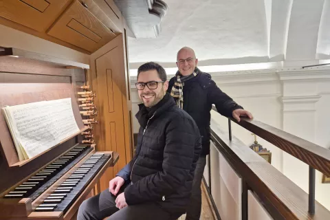 Luka Posavec je bil prvi organist, ki je letos zaigral na koncertu cikla Orgle opoldne, Klemen Karlin pa je tisti, ki že več kot eno leto bdi nad izbranim programom cikla. / Foto: Klara Mrak